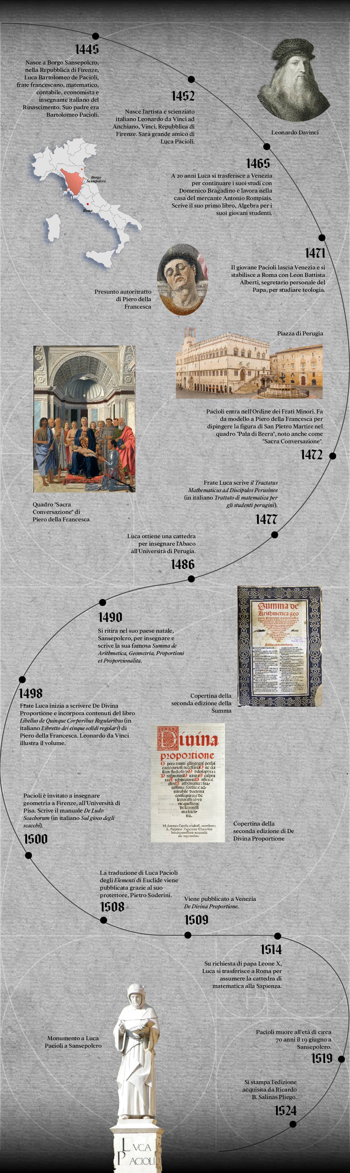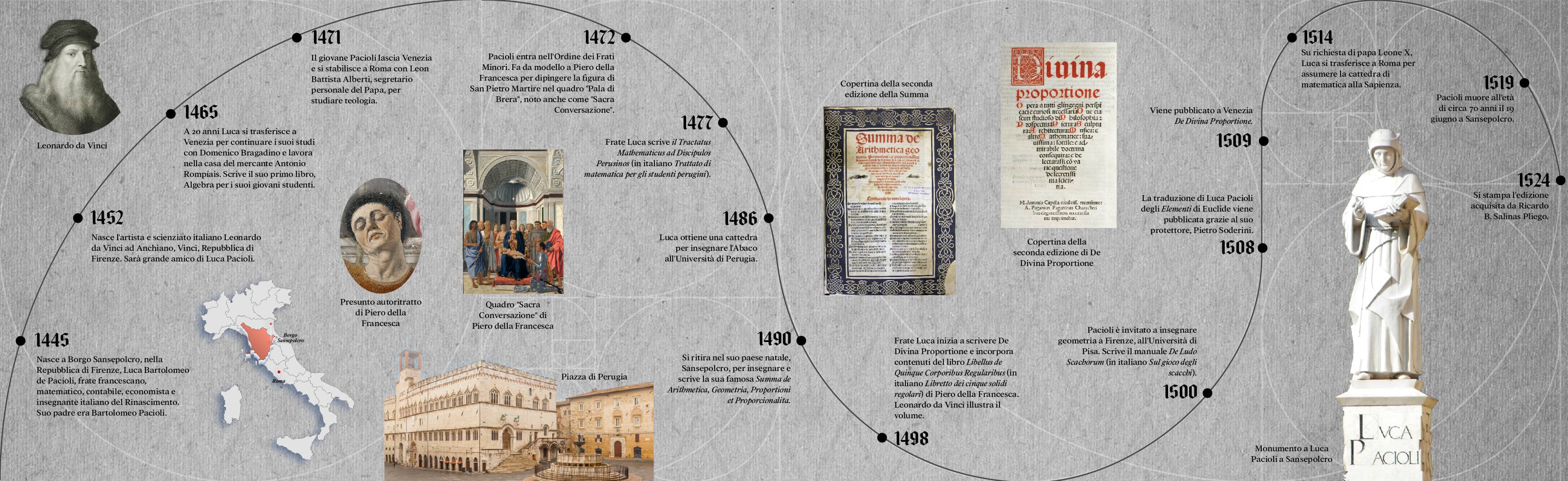 Attraverso un programma completo composto da interessanti conferenze, interventi artistici e diverse attività, ti avvicinerai a Luca Pacioli come essere umano, monaco francescano, artista, scienziato e matematico. Inoltre, gli incunaboli delle sue grandi opere, la Summa de Arithmetica, Geometria, Proportioni et Proportionalita e De Divina Proportione saranno a portata di mano per comprendere la sua rilevanza e importanza.